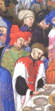 clair), et l'écuyer-tranchant (à droite, le personnage de dos en vert).
