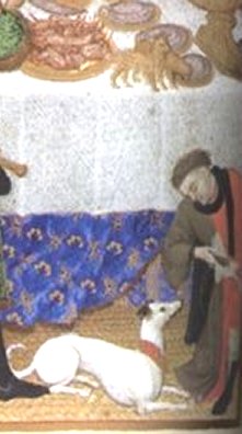 familiers du Duc. A l'extrême droite de la miniature, deux petits chiens se