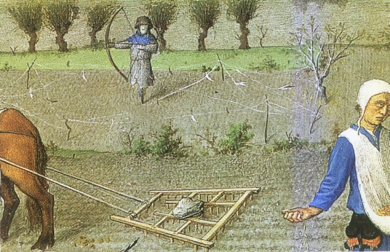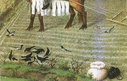 droite, un autre homme sème à la volée. Des pies et des corneilles picorent les