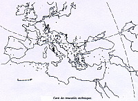 Le culte de Mithra est connu dans le monde romain dès la seconde moitié du Ier siècle de notre ère. D’origine indo-européenne, 2 000 ans sépare le Mithra iranien, qui n’était pas si éloigné des ancêtres des dieux du panthéon grec et romain, des premières représentations du Mithra tauroctone. La difficulté vient du fait que l’on ne sait pas trop comment le dieu iranien est passé dans le monde grec, ni comment il s’est transformé dans son rituel pour devenir le pivot d’un dieu à mystères. Dans la littérature védique, " Mithra est un dieu bienveillant, proche des hommes, un dieux lumineux et juste, qui donne la végétation luxuriante, la concorde et la santé " (R. Turcan), en sanscrit mitra signifie ami, amitié, comme le mihr persan. Le Mithra iranien aurait également des prérogatives de la guerre, le Xe Yasht (hymne), texte datant du règne de Cyrus l’Ancien, soit le VIe s. av. J.C., l’invoque aussi comme un " dieu combattant ", et comme un " dieu solaire ". Après une éclipse, Mithra réapparaît dans l’épigraphie des rois perses à dater d’Artaxerxès II Mnémôn (405-359 av. J.C.), il y était un dieu des armées en même temps qu’un dieu de la justice divine. Mithra a gardé de nombreux fidèles malgré l’effondrement de l’Empire perse dans les aristocraties iraniennes d’Asie Mineure, la dynastie parthe des Arsacides, l’inclut parfois dans les noms de ses rois, comme Mithridate Ier le Grand, ce nom signifiant " donné par Mithra ". Plus près de notre période, des officiers de Mithridate ont encadré ces pirates ciliciens qui pour Franz Cumont auraient introduit les mystères de Mithra à la fin de la République. Ce long cheminement a fortement marqué le culte de Mithra pour en faire ce qu’il est à l’époque de l’Empire romain, sachant cela, une série de questions s’imposent à nous : quels sont les grands traits du culte de Mithra ?, qu’est-ce qui fait de ce culte un culte un mystère réservé à des initiés ?, et quel a été son impact socio-politique mais aussi géographique ?. Pour tenter de répondre à ces questions nous disposons d’un certain nombre de sources. Les sources littéraires directes sont quasi inexistantes, seule des auteurs, souvent chrétiens, comme Tertullien ou Jérôme (lettre 107) nous apportent des indications. Les sources épigraphiques sont plus nombreuses, on a retrouvé un nombre important de dédicaces, d’inscriptions concernant le culte de Mithra. Une autre source importante pour l’étude de ce culte nous est apportée par l’archéologie, de nombreux lieux de cultes ont en effet été retrouvés. I- Les originesA. Dieu originaire de PerseLa religion perse repose sur l'opposition entre le dieu du mal et le dieu du bien, Mithra est au service du dieu du bien. Il est né d'un rocher, Natalis invictus. Mithra est vu comme une divinité de la lumière, protecteur de la vérité, il est représenté sur un char tiré par quatre chevaux et parcourant les espaces du firmament. Son culte, dès l'origine, est soumis à un cérémonial religieux, qui se retrouve dans le cérémonial romain. B. Hellénisation du culte et premiers contactsMithra est d'abord exclu du monde hellenique car il est perse. Il faut attendre le rôle des mages hellenisés pour voir fleurir ce culte dans des provinces orientales, en Arménie, en Commagène. Cette religion gagne l'Occident à l'époque des Flaviens II- Les fondements du culte de MithraLes fondements du culte de Mithra sont au moins au nombre de trois, le premier est le lieu lui-même, particulier à cette religion, la liturgie est tout autant singulière, c’est sur l’iconographie que reposait l’essentiel de l’instruction des fidèles. A. Le Mithraeum