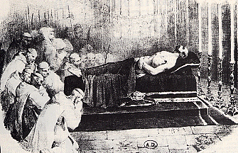 de ses funérailles, le cadavre, tassé dans un sarcophage trop
