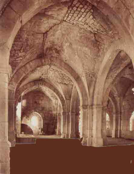 La salle haute, à laquelle on accède par un escalier ménagé dans la muraille. Elle est divisée en deux nefs par une file de trois piliers et défendue par dix archères dont le bas est en étrier pour un tir plongeant. Dans l'angle Sud-Ouest un escalier apparent conduit à la terrasse. Celle-ci avait gardé jusqu'à nos jours son crénelage. Un tremblement de terre, en 1925, en a détruit une partie. Il n'y a pas, comme dans d'autres châteaux des croisés, deux étages de défenses à la terrasse; ici les créneaux alternent avec les archères qui sont percées dans le bas des merlons. De cette terrasse on aperçoit le Crac des Chevaliers, Arima, d'autres tours. La nuit on pouvait communiquer avec ces forts par des signaux à feu. Maintes fois des expéditions contre les musulmans partirent en même temps du Crac et du Chastel Blanc. Maintes fois ces deux châteaux furent: attaqués au cours d'une même campagne. Beibars s'empara du Chastel Blanc en février 1271, juste avant d'entreprendre le siège du Crac. Aucun texte ne dit à quelle date cette forteresse fut confiée à la garde des Templiers, mais on peut la fixer avec vraisemblance car on sait que les forteresses de Chastel Blanc et d'Arima furent fort éprouvées coup sur coup en 1170 et 117I. En 1170 un violent tremblement de terre ébranla leurs murailles et l'année suivante, au cours d'une campagne Saladin s'en empara momentanément et y fit des dommages. Il fallait relever ces ruines. On peut penser que le roi Amaury qui, à la suite du séisme de 1170, avait donné à l'Hôpital pour les réparer les châteaux d'Akkar et d'Archas, agit de même avec le Temple pour Chastel Blanc et Arima. Les caractères de l'architecture de l'église-donjon de Chastel Blanc indiquent bien un monument de la fin du XIIe siècle. Dans les textes il est toujours question en même temps de Chastel Blanc et d'Arima. Le petit château d'Arima est situé sur un éperon entre deux cours d'eau, affluents du Nahr Abrash. En 1149 il appartenait à un, seigneur toulousain, Bertrand fils du comte Alphonse-Jourdain et petit fils de Raymond de Saint-Gilles. Bertrand fut enlevé par surprise à Arima et emmené en captivité ainsi que sa sueur. L'émir Nour ed Din aurait fait de celle-ci sa femme et elle en aurait eu un fils.
