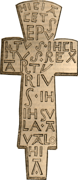 Arthur a été retrouvé de nos jours à Glastonbury, entre deux pyramides de pierre élevées jadis dans le cimetière, gisant profondément en terre dans un tronc de chêne creusé et, solennellement transféré dans l’église, il y a été pieusement déposé dans un tombeau de marbre. Une croix de plomb placée sur une pierre, non pas à l’endroit [comme c’est notre usage], mais à l’envers [je l’ai vue et j’en ai touché l’inscription, taillée non pas en relief, mais en creux, et tournée du côté de la pierre], disait : "Ici gît l’illustre roi Arthur, enseveli avec Wenneveria, sa seconde femme, dans l’île d’Avallonie".
