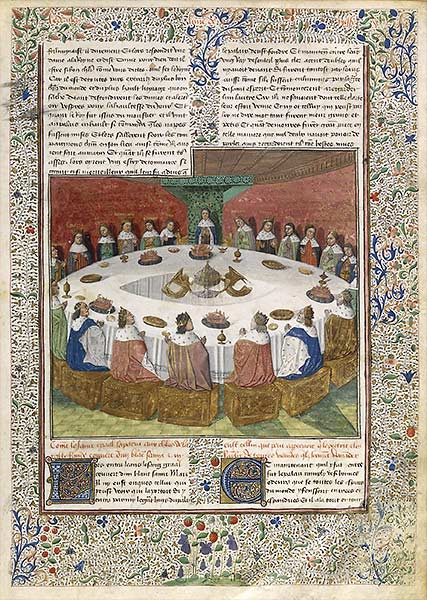 Peint dans l'entourage d'Évrard d'Espinques, ce volume de la compilation arthurienne réalisée par Micheau Gonnot pour Jacques V d'Armagnac est richement illustré. Il s'ouvre par la Quête du Graal. Le début du récit, retraçant l'arrivée de Galaad à la cour d'Arthur, est résumé par les quatre panneaux du frontispice et trois peintures. Il se poursuit au folio 5 avec une grande composition consacrée à l'événement surnaturel qui survient à Camelot, le soir de la fête de la Pentecôte, et va être le point de départ de la Quête. Après les vêpres, au moment du dîner, le roi et ses chevaliers attablés sont surpris par le bruit du tonnerre et une lumière céleste qui envahit la salle en même temps qu'apparaît le Saint Graal, représenté ici sous la forme d'un ciboire porté par deux anges. La légende assure que le vase précieux, symbole eucharistique, passe devant chaque convive pour le servir d'une substantielle et abondante nourriture. L'artiste a désigné les convives par des inscriptions en lettres d'or. Confondant Galaad avec son père, Lancelot, il a écrit par erreur le nom de ce dernier sur le Siège périlleux surmonté d'un dais, où seul un chevalier parfait destiné à "mener à fin les aventures du Graal" pouvait s'asseoir sans danger : le matin même, l'ermite Nascien y avait placé Galaad, le désignant ainsi comme le héros de la Quête (f. 3 vo).