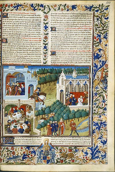 L’heureuse carrière politique d’Yvon du Fou († 1488) lui offrit les moyens de satisfaire ses goûts bibliophiliques. Sénéchal de Poitou, il confia à des libraires et enlumineurs locaux la confection de plusieurs ouvrages, dont le présent manuscrit. La Quête du Graal s’ouvre par une grande peinture encastrée dans la moitié inférieure de la page, juste au-dessus des armoiries du destinataire. L’artiste poitevin est reconnaissable à ses personnages courtauds et expressifs. Vêtus à la mode du règne de Louis XI, engoncés dans leurs jaquettes fourrées et leurs chaperons, les héros arthuriens ont gagné en bonhomie ce qu’ils ont perdu en élégance. La composition suit le fil du récit. À gauche, dans son château de Camelot, Arthur a réuni les chevaliers de la Table ronde la veille de la Pentecôte. Survient une messagère du roi Pellés (le roi du château du Graal, à Corbenic) qui enjoint à Lancelot de la suivre. Ils partent aussitôt et se rendent dans une abbaye, figurée à droite, où Galaad – le fils de Lancelot et de la fille de Pellès – a passé son enfance. Dans la chapelle, en présence des moniales et de ses cousins Bohort et Lyonnel, Lancelot adoube l’adolescent, qui sera conduit le lendemain à la cour d’Arthur par l’ermite Nascien. En attendant, Lancelot et ses compagnons regagnent Camelot. Au premier plan à droite, se déroule la première aventure merveilleuse de la Quête. Sur la rivière longeant le palais est apparu un rocher vermeil dans lequel est fichée une épée orfévrée, promise au meilleur chevalier du monde. Tandis que Lancelot refuse d’y mettre la main, Gauvain, obéissant à l’ordre d’Arthur, tente vainement l’épreuve, que seul Galaad réussira – reproduisant ainsi le geste par lequel Arthur avait été désigné comme roi légitime, à la fin du Merlin.