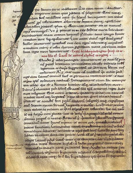 Dans les années 1137/1138, alors qu'il réside à Oxford, le clerc anglais Geoffroy de Monmouth rédige en latin l'Histoire des rois de Bretagne, qu'il dédie successivement à Robert comte de Gloucester, fils naturel du roi Henri Ier, à Étienne Ier, roi d'Angleterre, et à Waleran de Meulan. Cette chronique remplie de faits d'armes, d'invasions, de massacres, de trahisons, où Saxons, Pictes et Romains disputent le territoire aux Bretons, est aussi une histoire merveilleuse où se lisent pour la première fois la légende du roi Lear, les prodiges de Merlin, les fastes de la cour du roi Arthur. L'œuvre a rencontré un succès considérable (plus de deux cents manuscrits conservés). Elle a inspiré Chrétien de Troyes et connu plusieurs traductions, dont le Roman de Brut de Wace. Les Prophéties de Merlin inscrites au cœur du récit ont connu une fortune particulière. Le très beau dessin à la plume découvert par François Avril, et jusqu'à présent totalement inédit, est assurément l'une des plus anciennes représentations du roi Arthur. Sa position en marge du chapitre consacré à la succession du roi Uterpendragon et à l'élection d'Arthur ne laisse aucun doute sur l'identité du personnage. Le dessin élégamment tracé d'Arthur désignant de l'index le texte qui lui fait face confère à l'image le rôle de repère textuel. Vêtu d'une longue robe aux plis enserrés dans une large bande brodée et d'un manteau agrafé sur l'épaule droite, la tête ceinte d'une haute couronne gemmée à quatre pans surmontée de fleurons, Arthur est représenté comme un personnage royal du temps. Sa stature monumentale, son beau visage aux traits réguliers et sa longue barbe évoquent, non pas le guerrier du manuscrit de Douai, mais un souverain sage et vénérable. La qualité artistique du dessin ne le cède en rien à son intérêt iconographique. François Avril le rapproche, comme les initiales ornées, de l'enluminure telle qu'elle se pratiquait à l'abbaye du Mont-Saint-Michel, dans les premiers temps de l'abbatiat de Robert de Torigny. Sans conclure à une identité de main, on peut proposer une comparaison avec les superbes dessins à la plume qui illustrent le cartulaire du Mont réalisé dans les années 1154 à 1158.