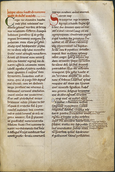 Au cœur de son Historia regum Britanniae, Geoffroy Monmouth a inséré les Prophéties de Merlin, qu'il rapporte avoir traduites du breton en latin. L'histoire se déroule à la cour du roi Vortiger. À la demande du roi, qui veut savoir pourquoi la forteresse qu'il fait construire ne cesse de s'écrouler, Merlin révèle ses dons exceptionnels de magicien et fait assécher l'étang caché sous terre. Alors deux dragons tapis dans les pierres se réveillent et engagent le combat. Merlin décrypte la victoire du dragon blanc sur le dragon rouge comme un présage de la victoire des envahisseurs saxons sur les Bretons. Ainsi commence une longue déclamation prophétique dans laquelle il décrit les événements futurs de l'histoire du royaume de Bretagne jusqu'à l'époque de Geoffroy et, au-delà, jusqu'à la fin des temps. Le devin emploie de nombreuses métaphores animalières : le "renard de Kaerdubal", "couleuvre de Lincoln", le "sanglier de Cornouailles" (Arthur)... qui contribuent donner au récit sa couleur à la fois poétique et énigmatique. Le texte aurait été rédigé à une date antérieure à celle de l'Historia, peu avant 1135. Les Prophéties, isolées de leur contexte, ont circulé sous forme indépendante et ont connu ainsi une large diffusion. Très tôt annotées, traduites, commentées, elles n'ont cessé au cours des siècles de susciter la curiosité et l'intérêt.