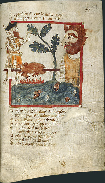 Les dessins à l'encre, avec un léger lavis de couleur, se placent difficilement dans la peinture anglaise du début du XIVe siècle, en raison de leur aspect plutôt rustique et d'un manque de sophistication qui tranche avec la peinture de la cour de Londres ou celle des établissements ecclésiastiques de l'East Anglia. Pourtant, la présence de nombreuses scènes insolites présentées avec vivacité fait de cet ensemble un recueil séduisant à sa façon. La confrontation d'Arthur et du géant du Mont-Saint-Michel, qui a enlevé la fille du duc de Bretagne, Hélène (celle-ci donnera son nom à l'îlot de Tombelaine, où elle serait ensevelie), commence dans la miniature du folio 49, qui forme une sorte de préambule. Arthur arrive devant l'énorme géant, vu de profil et à moitié masqué par la colline, en train de rôtir un sanglier. Le monstre est effrayant avec sa taille démesurée, ses sourcils broussailleux, sa barbe et ses cheveux rouges, ses oreilles pointues et poilues, sa langue semblable à celle d'un serpent et ses yeux exorbités : autant d'attributs diaboliques.
