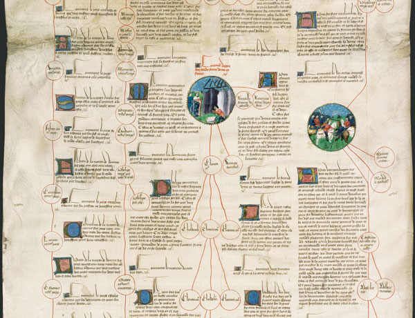 Sans doute destinées à de petits aristocrates peu fortunés, les Chroniques universelles sur rouleau fleurissent dans la seconde moitié du XVe siècle. Constituées de peaux de parchemin collées ou cousues ensemble, elles déroulent sur plusieurs mètres la succession, juxtaposée en colonnes, des papes, des empereurs de Rome, des rois de France et d'Angleterre, depuis la création du monde jusqu'au temps présent. Tel est le cas de la présente Chronique, longue de 17,75 mètres, qui s'achève en 1461 à la mort de Charles VII : elle est un des rares exemplaires d'un groupe d'une trentaine de Chroniques universelles à être aujourd'hui encore conservé en rouleau.