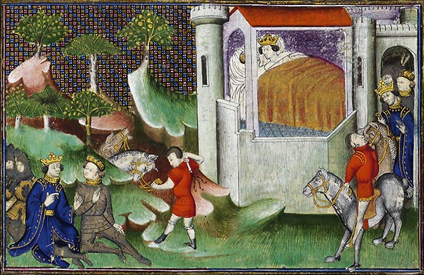 La miniature de la page 523, avec un très beau décor marginal, illustre sur trois registres l'histoire du chevalier Asalon, appelé aussi Hector du Chastel Ygerne, et du roi Meliadus, représentés attendant le neveu du roi d'Écosse qui a trahi Asalon pour épouser Tesalla, la fille d'Esera.