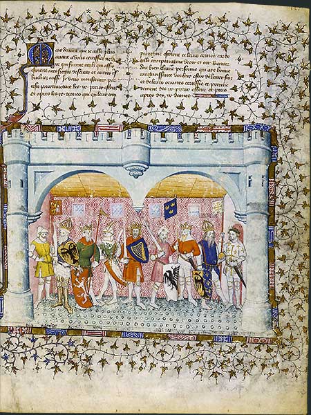 Sur l'enluminure du folio 125, les Preux apparaissent à l'intérieur de la grande salle d'un château aux murs crénelés : debout, disposés en frise (comme les statues des Preuses sur la cheminée du château de Coucy), ils sont identifiés par des inscriptions et tiennent un écu ou une bannière portant leurs armoiries. De chaque côté de David, seule figure représentée de manière frontale, sous la clé suspendue au centre de l'arcade dont il semble, symboliquement, être le pilier, les Preux sont répartis en deux groupes de deux personnages tournés l'un vers l'autre. Arthur tient une bannière ornée des trois couronnes symbolisant ses royaumes : Bretagne, Écosse et Angleterre.