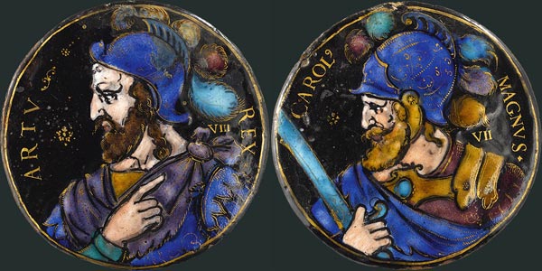 Ces deux médaillons appartiennent à une série de cinq pièces comprenant également Hector et Judas Macchabée (conservés au musée national de la Renaissance, au château d'Écouen) ainsi que Jules César (conservé au musée du Ranquet, à Clermont-Ferrand) : à l'origine, la série comprenait certainement l'ensemble des Neuf Preux. À la Renaissance, la thématique des Neuf Preux a été souvent représentée au sein de la production d'émail de Limoges, au point de figurer sous cette technique dans les collections d'Henri VIII d'Angleterre. Mais les héros sont majoritairement figurés sous forme équestre. Beaucoup plus rare est ici la représentation en buste, qui n'en conserve pas moins le caractère très décoratif de l'armement, avec l'avantage de la couleur par rapport aux modèles gravés.