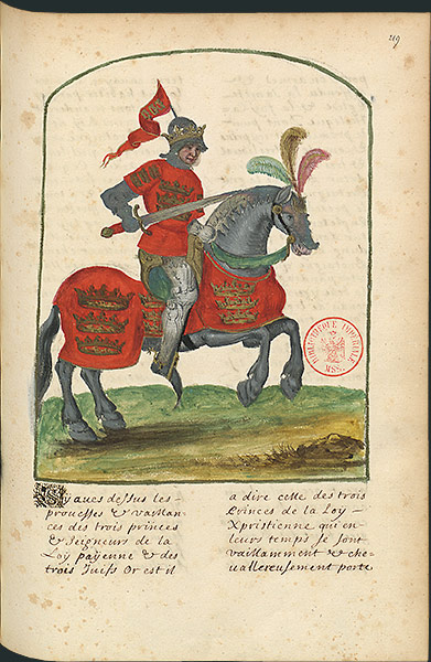 À chacun des Neuf Preux est consacré un chapitre, qui s'ouvre sur une peinture en pleine page le représentant. La section arthurienne occupe les folios 219-231. Alors que les autres sections semblent dériver principalement de la Chronique de Baudouin d'Avesnes, le texte de la partie arthurienne combine plusieurs sources : Geoffroy de Monmouth, le Roman de Brut de Wace, le Lancelot-Graal. Il parvient à rendre cohérentes des données parfois contradictoires, en les simplifiant et en supprimant tout ce qui évoque le surnaturel ou la prédestination. Renouvelant l'approche des récits arthuriens traditionnels, qui décrivent le règne d'Arthur comme un temps clos, il inscrit ainsi Arthur dans une continuité historique qui, s'étendant de l'Ancien Testament à Godefroy de Bouillon, ne commence ni ne s'achève avec lui.