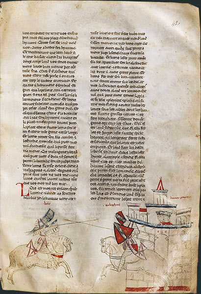 Le choix de l'emplacement des images en bas de page répond à une mode qui se développe dans la Péninsule au cours de la seconde moitié du siècle et affecte plus spécialement les textes historiques ou les romans. Elle offre l'avantage de souligner en quasi-continuité le récit en apportant les repères essentiels à la mémorisation de l'histoire, avec parfois l'indication des noms des personnages. L'épisode représenté au folio 42 se situe au moment où Guenièvre, précédemment enlevée par Méléagant, le fils du roi Baudemagu de Gorre, se trouve retenue sur la terre de ses ravisseurs. Après diverses épreuves, Lancelot affronte Méléagant. Le dessin montre le combat équestre entre les deux chevaliers, au pied du château de Gorre. Du haut de l'enceinte, Baudemagu, inquiet pour son fils, suit la joute en compagnie de la reine prisonnière.