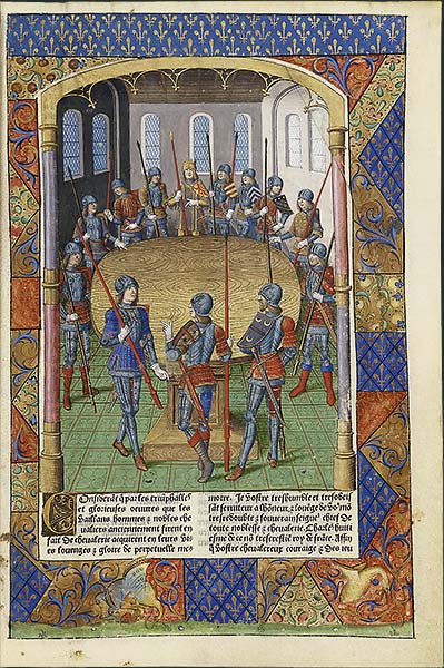 Les douze grandes gravures sur bois qui avaient déjà servi à d'autres éditions sont remplacées par des scènes plus en rapport avec le contenu de l'ouvrage - dont la peinture du folio A2 r°, très soigneusement exécutée par le maître de Jacques de Besançon, où l'on voit debout autour de la Table ronde le roi Arthur et ses douze chevaliers, portant chacun leur écusson en forme de bouclier. Ailleurs dans le texte, cent quarante petites peintures prennent la place des sommaires des chapitres, qui ont été reportés à la main dans les marges.
