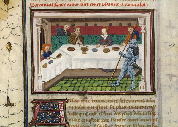 Le banquet est le cadre traditionnel du déclenchement des aventures dans les romans de la Table ronde : le roi Arthur, installé à table avec ses courtisans, reçoit un visiteur dont l'irruption vient rompre l'équilibre de la cour et du royaume. Ici c'est un chevalier cruel, Méléagant, qui vient défier Arthur à Camelot le jour de l'Ascension. Il exige qu'on lui livre la reine en échange des sujets d'Arthur qu'il retient en captivité dans son royaume de Gorre. En l'absence de Lancelot, c'est le sénéchal Keu qui relève le défi de défendre Guenièvre, mais il est vaincu et Méléagant s'enfuit avec la reine.