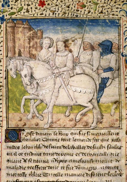 La blancheur de l'enluminure s'efforce de rendre compte du caractère extraordinaire, quasiment féerique, de l'équipage. La Dame du Lac regarde intensément Lancelot, très élégant avec un chapeau à plumes, la cravache à la main et l'épée ceinte à la taille. Derrière lui, un chevalier porte son écu, un écuyer tient sa lance.