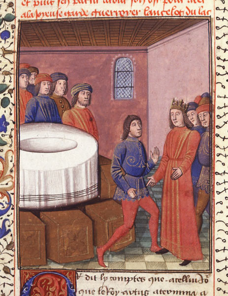 "Comment le roi Arthur combla les sièges de la Table ronde et puis partit avec toute son armée pour aller à la Joyeuse Garde guerroyer contre Lancelot du Lac."