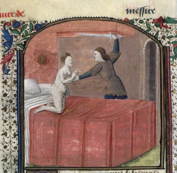 Lancelot, découvrant la trahison dont il a été l'objet, s'apprête à tuer la fille du roi Pellès, qui l'implore toute nue, à genoux sur le lit où ils ont passé la nuit.