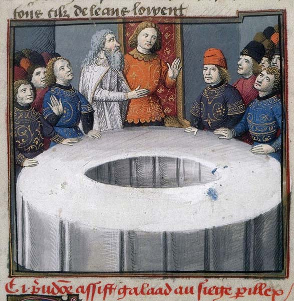 Sur les sièges de la Table Ronde sont inscrits les noms des chevaliers auxquels ils sont destinés, à l'exception d'un siège qui doit trouver son maître le jour de la Pentecôte, quatre cent cinquante quatre ans après la passion du Christ. Alors qu'on sert le repas arrive un vieil homme vêtu de blanc qui amène un chevalier à l'armure vermeille, sans épée ni écu, un descendant de David et de Joseph d'Arimathie, à s'asseoir sur le Siège Périlleux. Le jeune chevalier est Galaad, le fils de Lancelot, celui qui accomplira les aventures du graal.