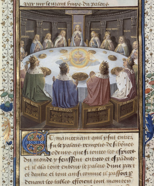 Aussitôt qu'il fut entré, la salle s'emplit de bonnes odeurs comme si toutes les épices du monde y avaient pénétré et s'y étaient répandues. Le Graal parcourut toute la pièce, de part et d'autre, et au moment où il passait devant les tables, celles-ci se remplissaient immédiatement devant chaque place de de la nourriture que chacun désirait. Tous furent servis et le saint Graal disparut si rapidement qu'ils ne surent ce qu'il en advint. Les chevaliers qui ne pouvaient dire un mot auparavant purent alors parler et ils bénirent Notre Seigneur de leur avoir accordé une telle faveur et un tel honneur en les comblant de la grâce du saint Graal. Mais le roi Arthur fut le plus joyeux et le plus heureux de tous car Dieu lui avait accordé plus de grâces qu'à aucun autre avant lui.