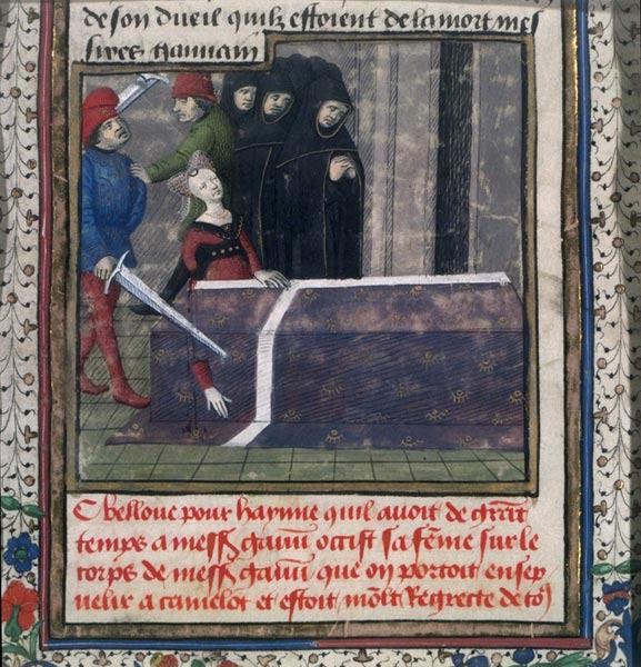 "Comment Béloé, par haine qu'il avait pour Messire Gauvain depuis longtemps, occist sa femme sur le corps de Gauvain que l'on allait ensevelir à Camelot et qui était regretté de tous"