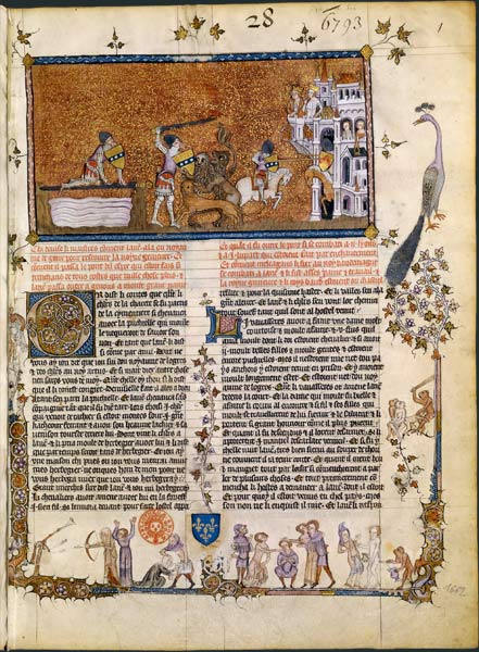 Sur un riche décor rouge-orangé aux volutes dorées caractéristique des manuscrits du XIVe siècle, l'enluminure présente simultanément trois étapes de l’action : le franchissement du pont et les blessures de Lancelot, le combat avec les lions, l’assaut final contre Méléagant. Le peintre a choisi de souligner ici la cohérence de l’aventure en créant, par le fil conducteur du personnage de Lancelot, trois moments dans la miniature et réservant – conformément au crescendo dramatique – la partie droite de l’enluminure à la finalité de cette mise en péril : la reine Guenièvre.