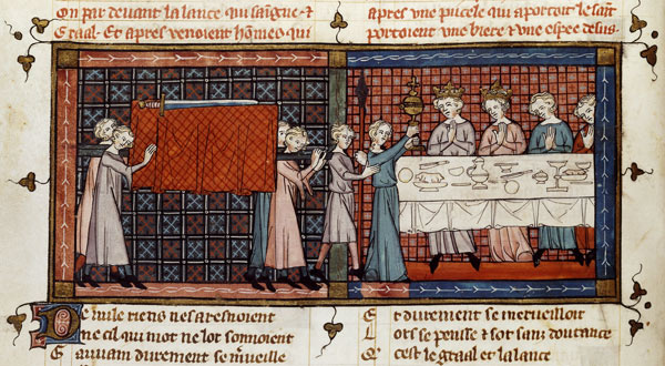 Devant la table du Roi-Pêcheur, couverte de plats et de mets, passe le cortège du Graal. En tête, une jeune fille élève de ses deux mains le vase sacré. Derrière elle, un jeune homme tient la "Lance qui saigne" : il s'agit de la lance qui perça le flanc du Christ sur la Croix. Suivent quatre jeunes gens portant une bière où repose le corps du roi, frappé par un "Coup Félon", et dont l'épée brisée est étendue sur l'étoffe rouge.