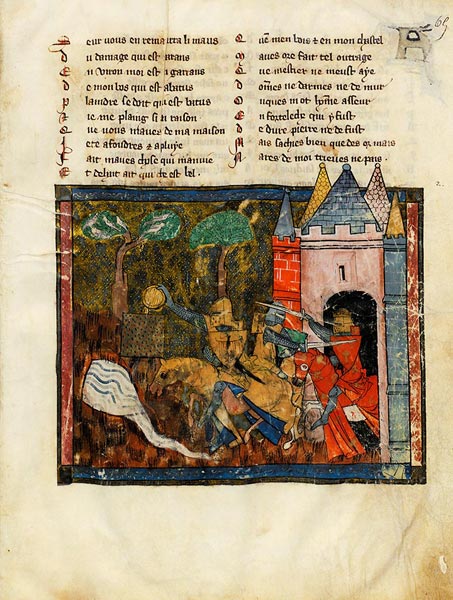 Pour illustrer cette aventure située explicitement au-delà du réel, le peintre a composé un véritable tableau fantastique où le personnage central est dédoublé : muni du bassin d'or qui pend à l'arbre couvert d'oiseaux, le chevalier, lancé au galop, verse l'eau sur le perron de la fontaine qui coule au-dessous. Calogrenant se retourne aussitôt pour en affronter le gardien, Esclados le Roux, qui sort de son château apparu soudain d'un Autre Monde. Ce dédoublement du personnage, procédé très répandu chez les illustrateurs du Moyen Âge, permet au peintre d'évoquer la quasi-simultanéité du défi de Calogrenant et de la réaction du gardien de la fontaine. Le dédoublement du héros crée un lien très fort entre les scènes juxtaposées, dans un effet de mouvement quasi-cinématographique.