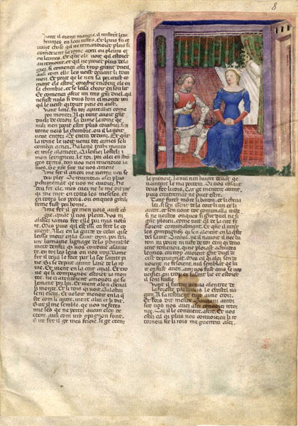 « La reine demanda à un valet si Gauvain et Lancelot étaient compagnons de cette Quête. Quand il le lui confirma, la reine fut si dolente qu'elle pensa mourir de deuil. Peu après, elle s'approcha de Galaad et s'assit à ses côtés, le questionnant sur son lignage. Il répondit, mais de ce qu'il fût le fils de Lancelot, il ne souffla mot et bien qu'elle insistât, elle n'en sut pas davantage. Le lendemain, les chevaliers se rendirent à l'église, entendirent l'office et revinrent au palais. Sur le conseil du roi Baudemagu, Arthur fit apporter les reliques des saints. On appela Galaad; il s'agenouilla et jura, en loyal chevalier, qu'il maintiendrait la Quête un an et un jour et plus encore s'il le fallait, et que jamais il ne reviendrait à la cour qu'il n'eût appris la vérité du Saint-Graal, s'il pouvait l'apprendre de quelque manière. Lancelot fit même serment puis tous les compagnons de la Table Ronde les uns après les autres. Quand la reine les vit sur le point de partir, elle entra dans sa chambre et se laissa choir sur son lit en telle affliction que nul au monde n'aurait pu ne pas en avoir pitié. Lancelot, ému plus que tout autre de la douleur de sa dame, se rendit dans la chambre où il l'avait vue entrer. "Ha ! Lancelot, s'écria-t-elle, vous m'avez trahie et réduite à la mort, vous qui me laissez pour aller en terre étrangère d'où vous ne reviendrez pas si Notre Sire ne vous en ramène." – "Dame, fit-il, si Dieu le veut, je reviendrai plus tôt que vous ne le croyez." La reine lui ayant donné son congé, Lancelot retrouva ses compagnons qui l'attendaient pour partir. Quant ils quittèrent la ville, tous ceux de la cité, riches et pauvres pleuraient à chaudes larmes. »
