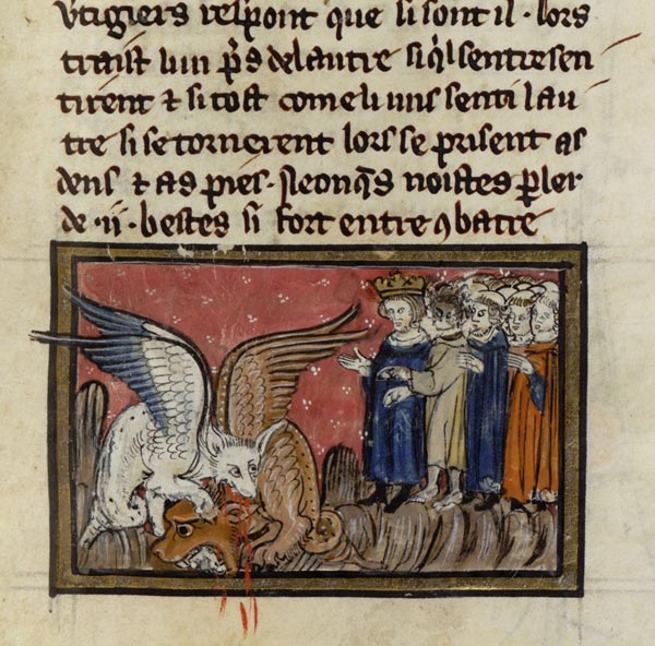 L'usurpateur Vortigern (ou Vertiger) est monté sur le trône de Grande Bretagne grâce à l'assassinat du jeune roi Maine, le fils aîné du roi Constant dont il était le plus puissant conseiller. Tandis que les deux fils cadets de Constant, Uter et Pandragon, sont mis en sécurité sur le continent, Vortigern prend le pouvoir en s'alliant avec les Saxons, des païens ennemis traditionnels des Bretons, dont il épouse la fille de leur chef Angis. Le pouvoir de Vortigern reste cependant instable. Alors qu'il cherche à édifier une tour pour se protéger, un prodige entrave sans cesse sa construction : à plusieurs reprises, la tour s'effondre sur elle-même sans raison. Le roi recourt au conseil des sages qui ne parviennent pas à établir la cause du prodige. En revanche, ils ont une vision, celle d'un enfant sans père qui constitue pour eux une menace mortelle. Ils persuadent alors Vortigern de faire couler le sang de cet enfant pour assurer la construction de sa tour. Mais l'enfant s'avère être Merlin. Il déjoue le complot en montrant à Vortigern que ce sont deux dragons, l'un blanc et l'autre rouge, enterrés sous la tour, qui ébranlent l'édifice. Ils vont s'affronter dans un combat qui annonce et symbolise la lutte à venir entre Vortigern et les héritiers du roi Constant. Ce prodige annonce le débarquement imminent d'Uter et Pandragon qui veulent venger leur père et reprendre leur royaume.