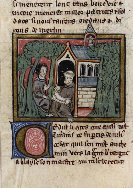 Blaise, le confesseur de sa mère, s'est retiré dans les forêts du Northumberland où il est chargé de mettre par écrit l'histoire de Merlin. L'enchanteur vient visiter dans son ermitage celui qui vite devient un secrétaire et un confident : Blaise est l'auditeur privilégié des prophéties de Merlin et leur témoin lorsqu'elles adviennent.