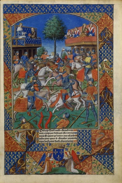 Le Lancelot prolongé ici par la Quête du Saint Graal et la Mort le Roi Artu jouissait d'une grande popularité au Moyen Âge comme en témoignent de nombreux manuscrits parvenus jusqu'à nous. Cet exemplaire du cycle, imprimé sur vélin et soigneusement enluminé par le Maître de Jacques de Besançon, fut présenté à Charles VIII par le libraire parisien Antoine Vérard, fournisseur attitré de la Cour. En tête du premier volume figure une grande peinture représentant un combat de lances dominé par des tribunes où l'on voit le roi à qui Vérard remet un exemplaire de l'ouvrage.