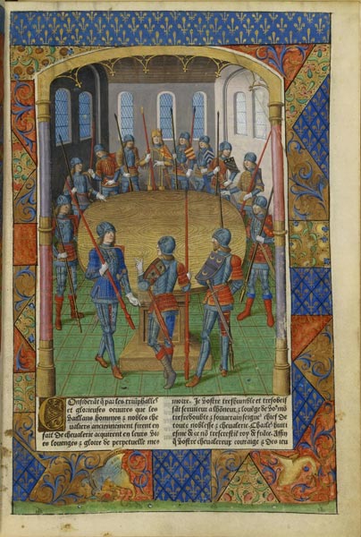 Le Lancelot prolongé ici par la Quête du Saint Graal et la Mort le Roi Artu jouissait d'une grande popularité au Moyen Âge comme en témoignent de nombreux manuscrits parvenus jusqu'à nous. Cet exemplaire du cycle, imprimé sur vélin et soigneusement enluminé par le Maître de Jacques de Besançon, fut présenté à Charles VIII par le libraire parisien Antoine Vérard, fournisseur attitré de la Cour.