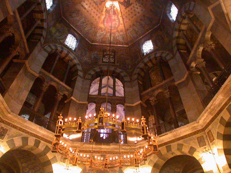 se trouve à l'ouest le trône de Charlemagne et un deuxième autel à l'est,