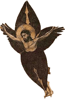 - l'ange lumineux et musicien : au XIIIe siècle, on observe une nouvelle insistance sur la lumière et la hiérarchie des anges, avec l'idée d'une approche graduelle de la lumière. Les anges forment une cohorte lumineuse et souvent musicale. - l'ange gardien individuel : le XIIe siècle est celui de la "découverte" de l'individu. Les anges gardiens individuels apparaissent à cette période, avec la multiplication des images de dévotion personnelles. Progressivement, l'ange gardien l'emporte sur l'ange messager de Dieu. Les anges gardiens sont une exhortation au perfectionnement et laissent penser à une omniprésente surveillance divine. Ils répondent à une angoisse du salut : l'ange est présent près du lit du mourant dans les arte moriendis. Il est un guide au moment de la mort et protège le mourant contre le diable. - l'ange protecteur collectif : ce mouvement prend corps en Aragon au XIVe siècle. Chaque cité célèbre son ange et les villes s'identifient à la Jérusalem céleste, protégée par des anges et des archanges. Le culte des anges a ici un caractère défensif. Ci-contre, un séraphin (détail du St François d'Assise de Giotto, Louvre) |
