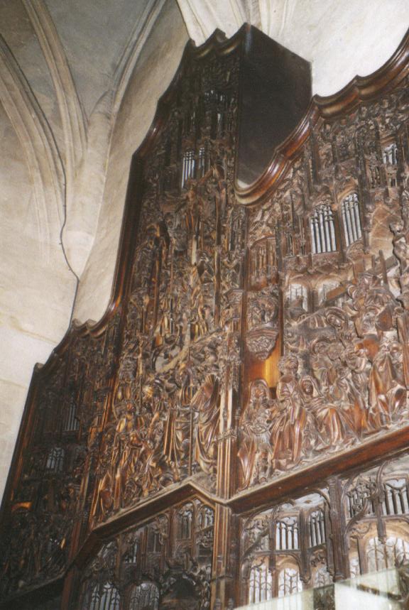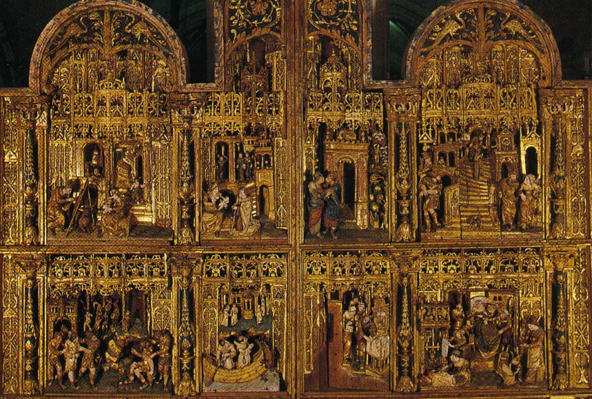 Le premier se trouve dans la quatrième chapelle du collatéral gauche. C'est un retable anversois en bois verni datant du début du XVe. Au premier registre, scindé en 5 scènes, on trouve de gauche à droite : le mariage de la Vierge, la naissance du Christ, le songe de Jessé, (scène plutôt atypique pour un retable anversois), l'Adoration des mages et la Présentation au temple. Le registre supérieur représente de façon plus classique la montée au calvaire, la crucifixion et la descente de croix. La réalisation de ces trois scènes est très semblable aux scènes correspondantes du retable de la Passion qui se trouve au Louvre. |