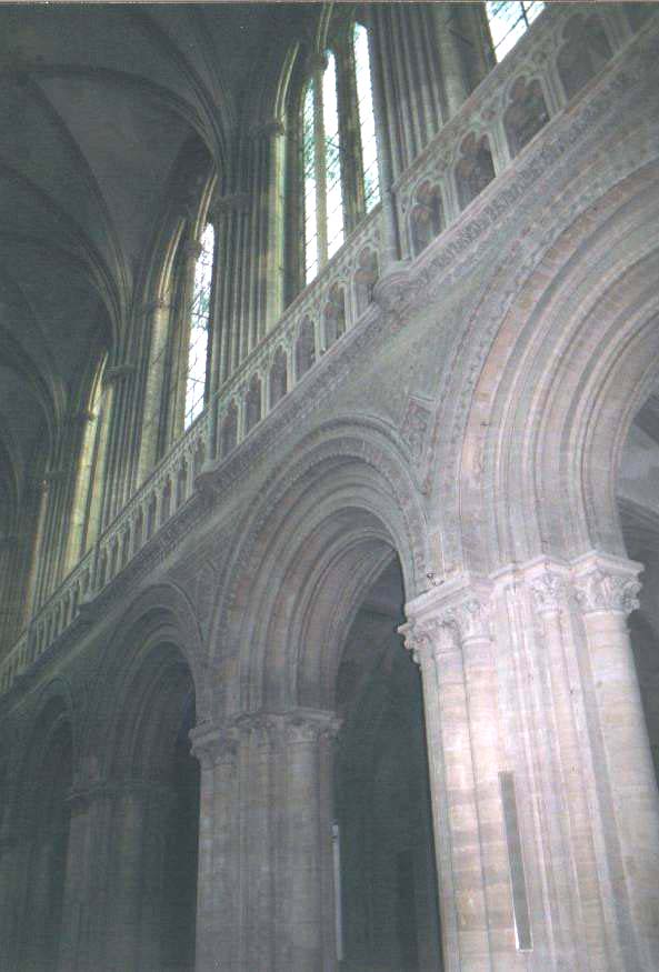 une tribune d'orgue. Dans la deuxième, on trouve des arcades géminées aveugles. Sur un faux triforium, le dernier niveau reprend