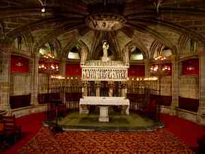 d'une superbe voûte en réseau. Elle abrite une statue du