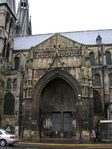 Au sud, on trouve un porche de style gothique flamboyant, qui abrite un portail du XIIe. Le tympan a été soigneusement martelé et on n'y décèle que la silhouette d'un Christ entouré du tétramorphe. |