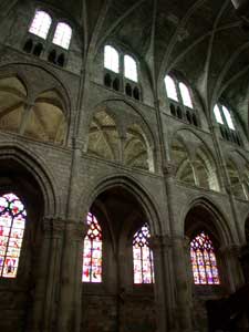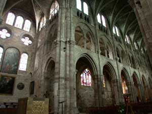 Le chœur est ceint d'un déambulatoire voûté d'ogives. Il ouvre sur trois chapelles rayonnantes peu profondes. L'architecte a adopté une solution originale pour conserver des croisées d'ogives à plan carré tout en faisant tourner le vaisseau. Il a donc ajouté deux fines colonnes intermédiaires à l'entrée des chapelles. |