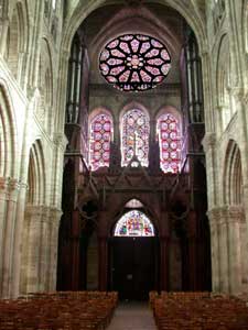 Au revers, le fenestrage comprend une rose rayonnante, précédée de trois fenêtres brisées. Les vitraux sont du XIXe siècle. |
