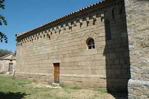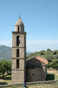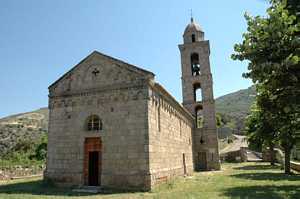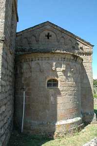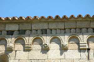 La façade de l'église présente la même composition que celle de Santa-Maria-Figaniella : ne manque que la rangée de redents au-dessus des modillons, aux figures humaines ou géométriques. |