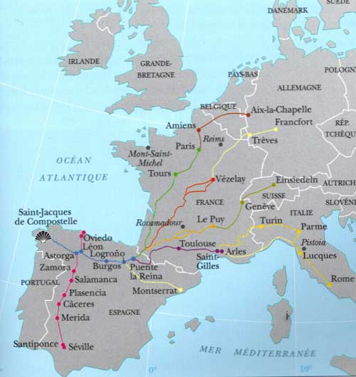 Carte des principales routes vers Compostelle, d'après les Chemins de St Jacques de Compostelle, éditeur MSM