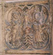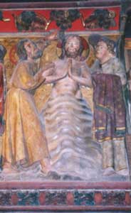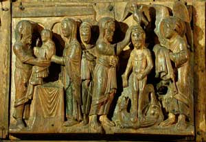 Il est assez fréquemment représenté dans la sculpture des chapiteaux (comme à Moissac), dans des médaillons (ci-contre, médaillon de St Jean de Lyon) ou dans les clôtures de chœur (ci-dessous, clôture de Notre Dame de Paris) consacrées à la vie du Christ. Ci-contre, la Présentation au temple et le baptême, Sankt Maria im Kapitol, Cologne |
