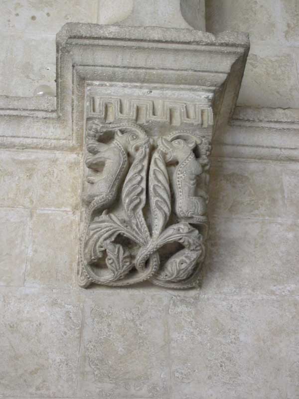 Il ne reste que peu de chapiteaux romans, excepté dans la galerie est. Ci-contre, un chapiteau plus récent, situé dans la galerie nord. |
