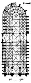 de deux travées, est couverte par des voûtes sexpartites qui reposent