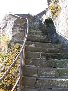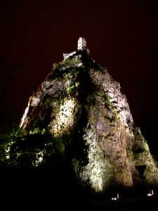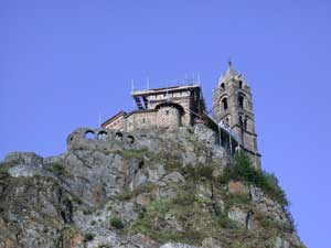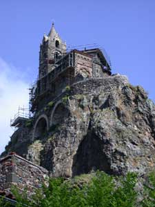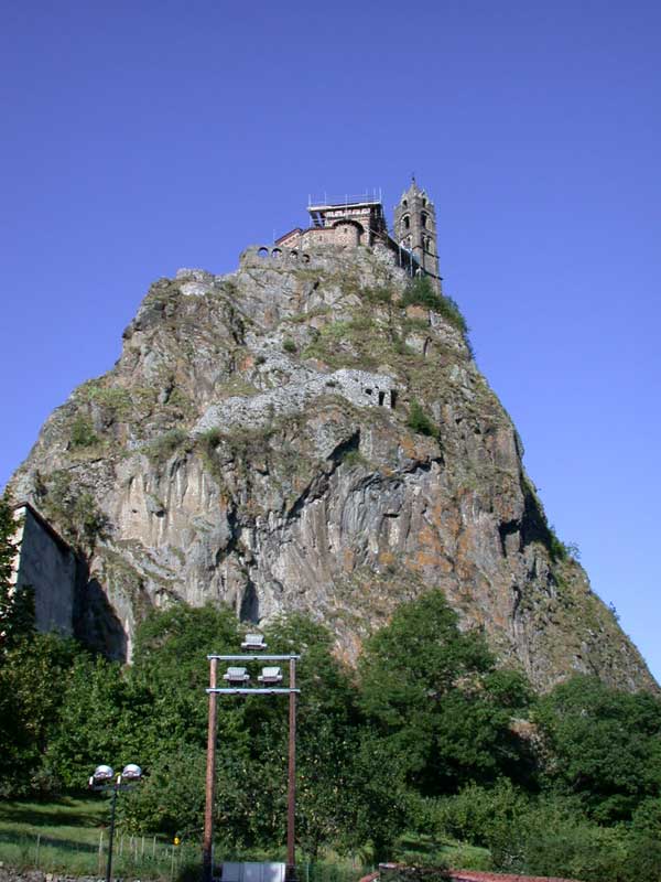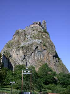 Le rocher d'Aiguilhe est considéré comme une montjoie (pyramide de pierre élevé par les pèlerins) naturelle. Il s'agit d'un piton volcanique. Une légende celtique s'y rattache et des archanges y étaient traditionnellement vénérés. On trouve de nombreuses excavations dans la roche : elles accueillaient des ermites. |