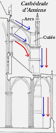 Quant à l'arc boutant, il est particulièrement utilisé au XIIIe siècle. Ce système d'arcs extérieurs qui donne à la cathédrale vue de haut l'aspect d'une araignée géante, permet d'absorber la poussée extérieure des murs pour la diriger vers le sol comme le schéma de gauche l'indique. La poussée passe d'abord par l'arc reliant l'édifice à la culée, héritière des contreforts romans, et qui reçoit l'ensemble de la poussée. Cette innovation importante augmente la hauteur. Très vite, les évêques, les architectes veulent construire selon "l'art de France" et édifier la nouvelle maison de Dieu. Le temps des cathédrales sera le siècle de l'édification.