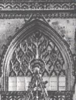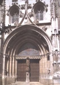 La véritable évolution a lieu au XVe siècle avec un nouveau style de l'art gothique particulièrement reconnaissable : le gothique flamboyant. Le gothique dit flamboyant répond à une exigence de progrès, il tente de trouver une nouvelle expression pour ne pas sombrer faute de n'avoir pas su s'adapter. Les fioritures architecturales sont omni-présentes dans la façade, les voûtes et ses clefs (photo de gauche). Les fenêtres ont souvent, dans leur partie supérieure, des nervures ondulées en formes de petites flammes, d'où le nom de flamboyant pour dénommer ce style du XVe siècle. Quant au piliers, ils n'ont plus de chapiteaux et les arcs des voûtes viennent pénétrer directement dans les colonnes. Autre aspect typiquement flamboyant, l'arc en accolade (à droite) qui surplombe une lucarne ou une porte d'entrée et qui accentue l'esthétisme général de l'édifice (photo de droite). Rouen avec son hôtel de ville ou Bordeaux avec l'Eglise Saint-Eloi marquent le point d'orgue de ce gothique flamboyant qui use de la décoration plus que de l'aspect technique, déjà bien travaillé antérieurement.